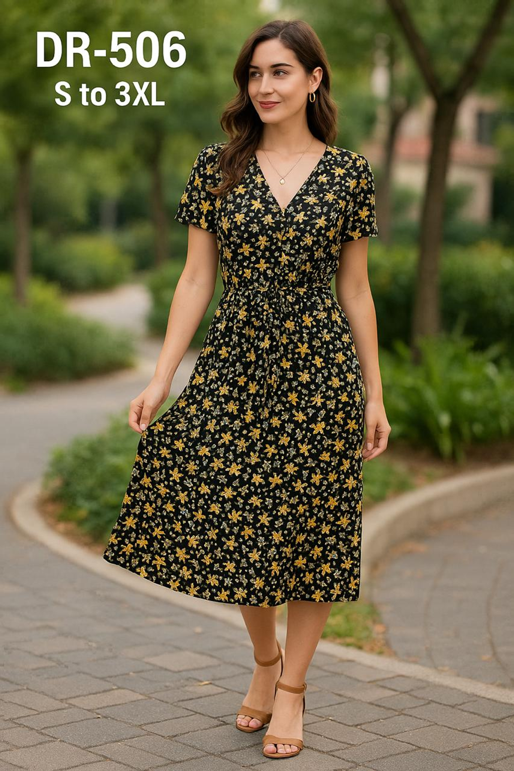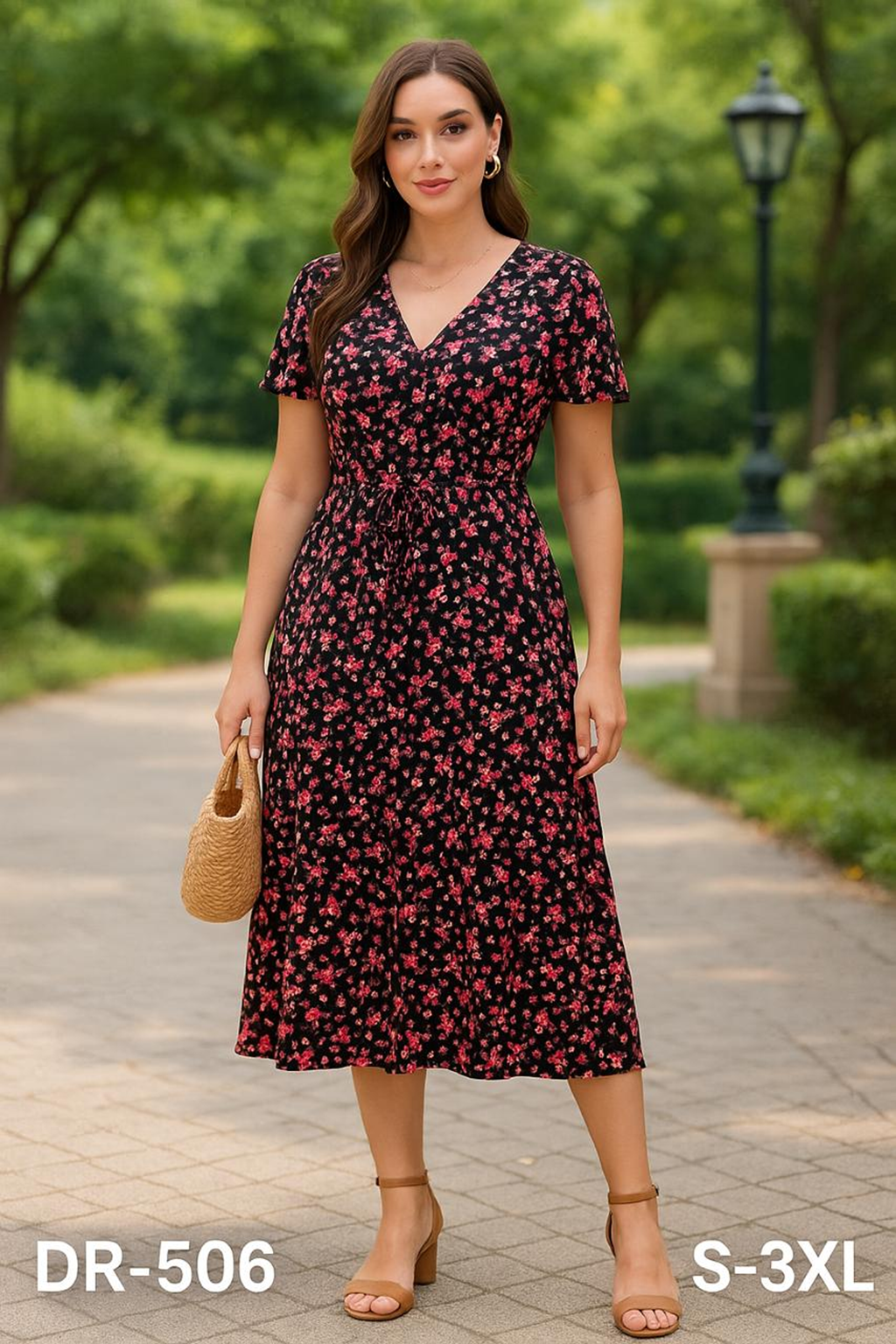 | Description | A soft and elegant everyday midi dress featuring a flattering V-neckline, short sleeves, and an adjustable waist tie for a comfortable, feminine fit. Designed in a flowy silhouette that drapes beautifully, making it perfect for casual outings, workwear, or weekend wear. | A soft, flowy midi dress with a flattering elastic waist and V-neckline. Designed with a relaxed fit and elegant drape, it’s perfect for everyday wear, outings, and casual occasions. The airy fabric and printed pattern give it a stylish, feminine look while staying comfortable all day. | Description: A classic and versatile button-down dress with delicate floral patterns and a waist tie that enhances shape. Ideal for both casual outings and semi-formal occasions | A soft, flowy midi dress with a delicate floral print, short sleeves, and a relaxed tiered fit. Lightweight and comfortable, perfect for everyday wear, outings, or casual occasions. Available in a flattering silhouette that suits all body types. | A light, flowy sleeveless midi dress featuring a vibrant tropical floral pattern. Designed for comfort and effortless style, it has a relaxed fit that’s perfect for warm days, holidays, and casual outings. Available in sizes S–3XL. | A soft, flowy midi dress with a flattering elastic waist and V-neckline. Designed with a relaxed fit and elegant drape, it’s perfect for everyday wear, outings, and casual occasions. The airy fabric and printed pattern give it a stylish, feminine look while staying comfortable all day. |