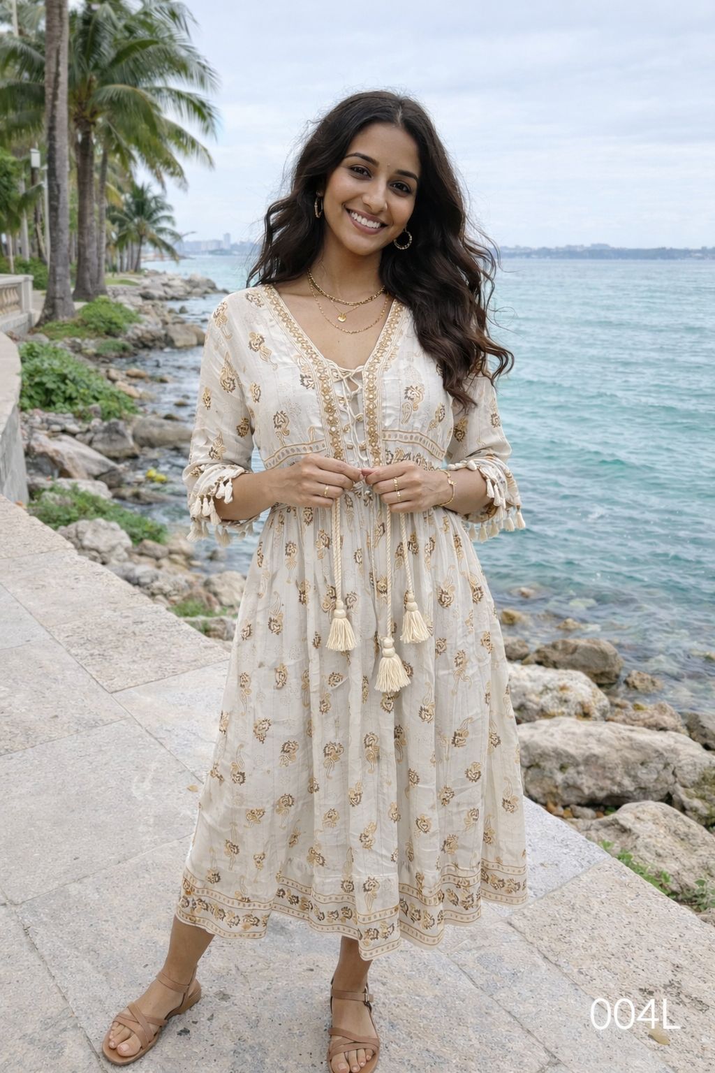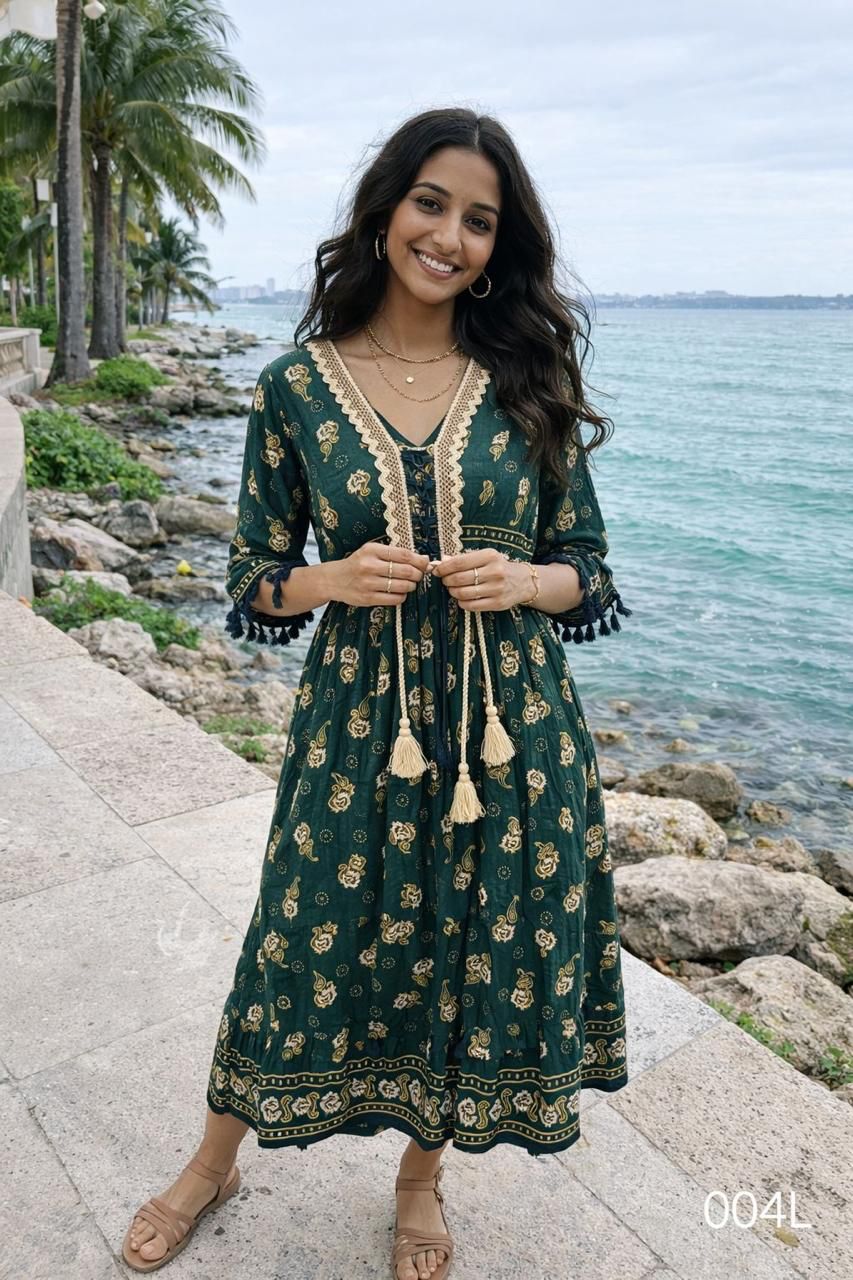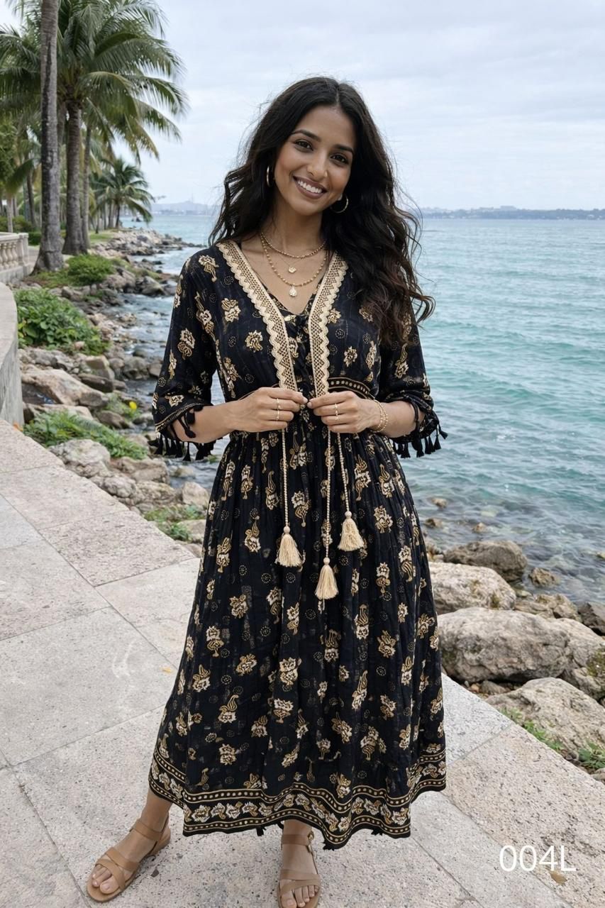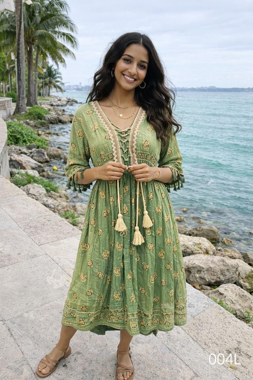 | Description | | A graceful, loose-fit ankle-length kaftan featuring a flattering V-neckline, soft flowy sleeves, and elegant central embroidery inspired by traditional motifs. The adjustable waist tie adds gentle shape while keeping it comfortable and modest — perfect for everyday wear, casual outings, or relaxed occasions. | A relaxed, flowy midi dress designed for effortless comfort and style. Features a loose silhouette, soft breathable fabric, and elegant wide sleeves, making it perfect for warm weather, holidays, and everyday wear. | A soft and elegant everyday midi dress featuring a flattering V-neckline, short sleeves, and an adjustable waist tie for a comfortable, feminine fit. Designed in a flowy silhouette that drapes beautifully, making it perfect for casual outings, workwear, or weekend wear. | A soft, flowy sleeveless maxi dress designed for effortless everyday elegance. Featuring a gathered waist for a flattering fit and a lightweight drape that moves beautifully, this piece is perfect for warm days, casual outings, or holiday wear. Comfortable, modest, and stylish with a natural relaxed feel. | A graceful tiered maxi dress featuring elegant paisley print panels with delicate lace detailing on the neckline and tiers. Designed with soft vertical stripes and flowy sleeves, this dress offers a modest, comfortable fit that’s perfect for everyday wear or casual outings while maintaining a stylish, feminine look. |
