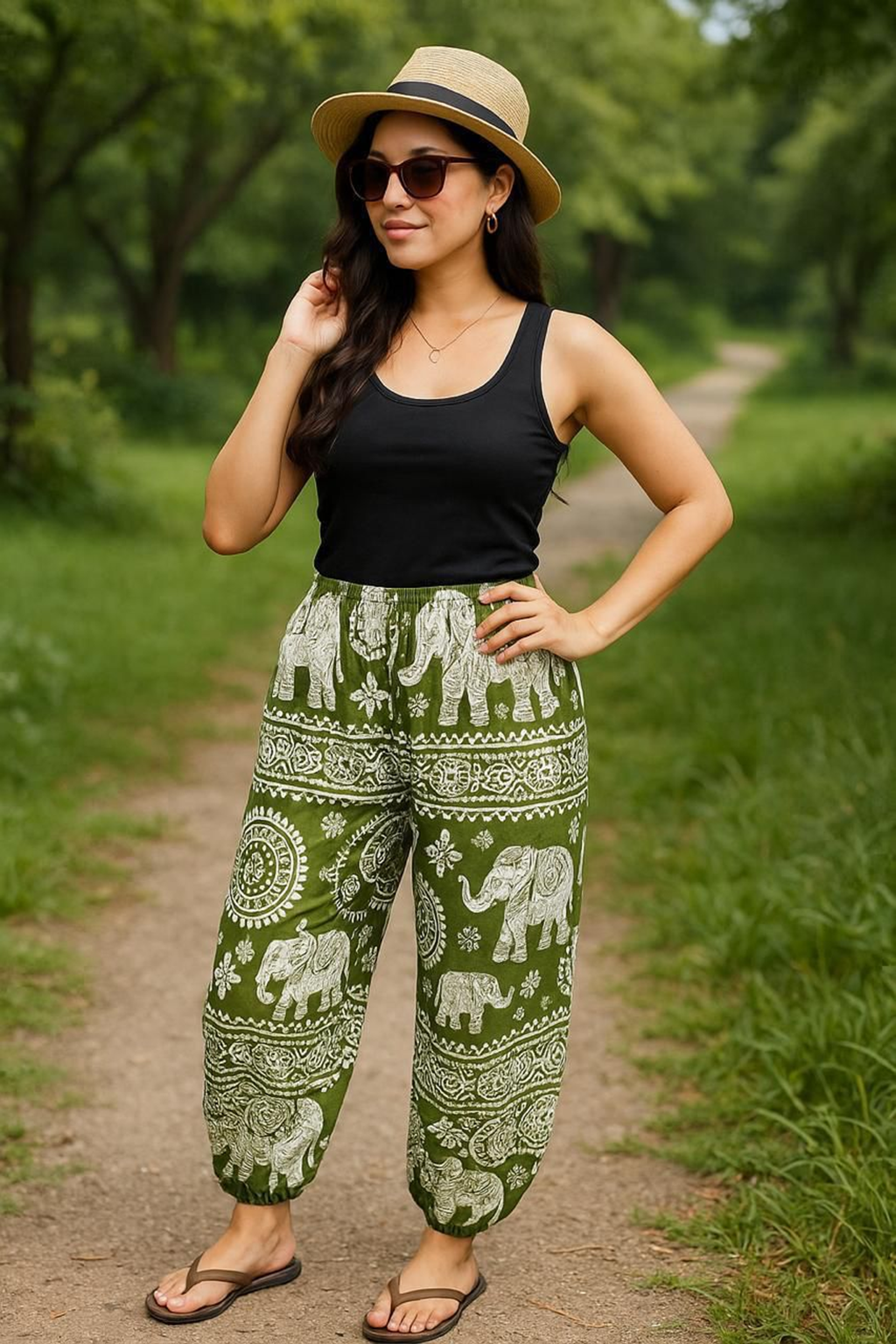 | Description | Relaxed, lightweight harem pants featuring a striking elephant print with boho-inspired patterns. Designed with an elastic waistband and tapered ankle fit for comfort and effortless everyday style — perfect for casual outings, travel, or summer wear. | Soft, relaxed-fit bohemian harem pants featuring eye-catching circular mandala prints and an elasticated ankle finish. Designed for all-day comfort with a loose, airy feel and side pockets, making them perfect for casual wear, travel, or lounging in style. | Lightweight, relaxed-fit unisex jogger pants designed for everyday comfort and casual style. Features an elastic waistband, side pockets, and ankle cuffs for a modern sporty look. Perfect for daily wear, travel, or lounging. | Comfortable, loose-fit lounge pants with a soft elastic waist and drawstring tie. Designed with elegant traditional gold motifs and side borders for a stylish ethnic touch. Perfect for casual wear, travel, or relaxed everyday outfits. | A soft, flowy sleeveless maxi dress designed for effortless everyday elegance. Featuring a gathered waist for a flattering fit and a lightweight drape that moves beautifully, this piece is perfect for warm days, casual outings, or holiday wear. Comfortable, modest, and stylish with a natural relaxed feel. |